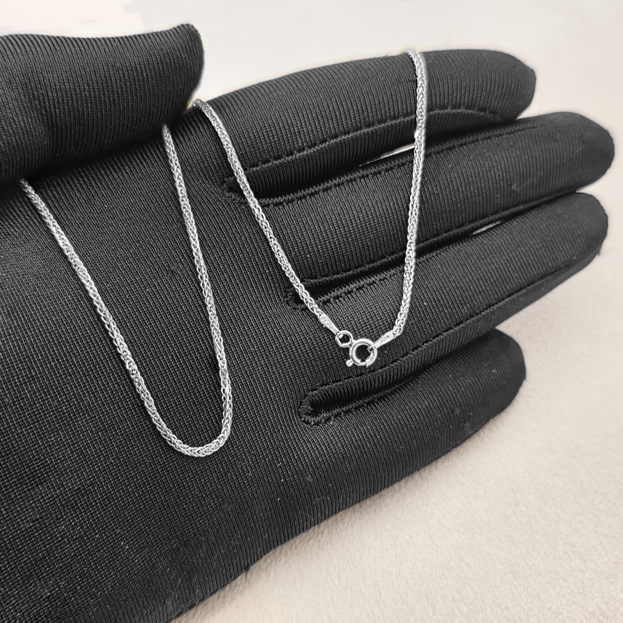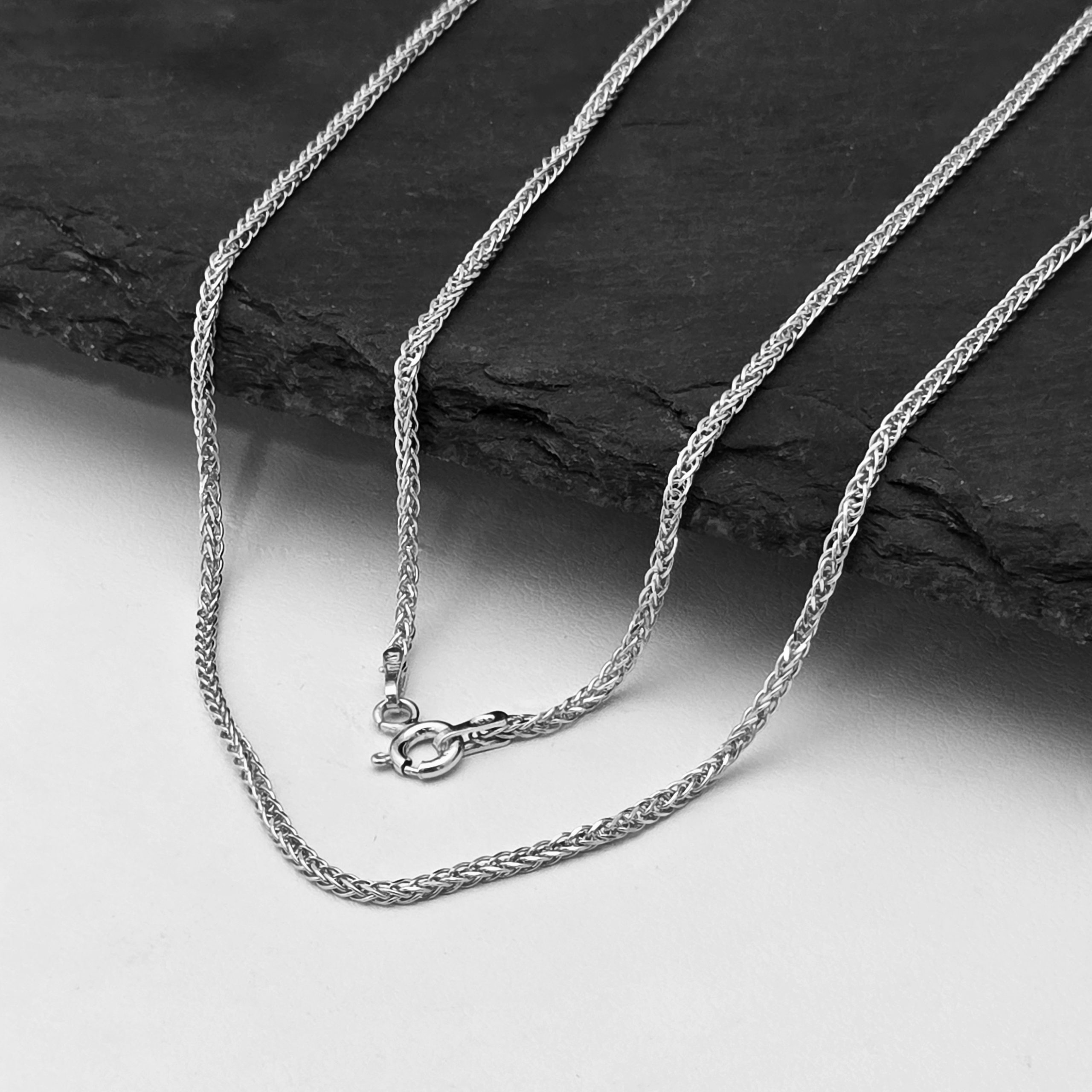 Ten łańcuszek to elegancki i klasyczny dodatek do każdej kolekcji biżuterii. Jest to łańcuszek typu „spiga”, który jest znany z wytrzymałości i wyjątkowego, splecionego wzoru, przypominającego kształtem pszenicę. Wykonany jest ze srebra najwyższej jakości, na które nałożono warstwę rodu, nadając mu luksusowy i ciepły wygląd rodowanej biżuterii. Zapięcie typu karabińczyk zapewnia bezpieczeństwo i łatwość zakładania. Idealny jako samodzielny element lub do noszenia z wisiorkiem.