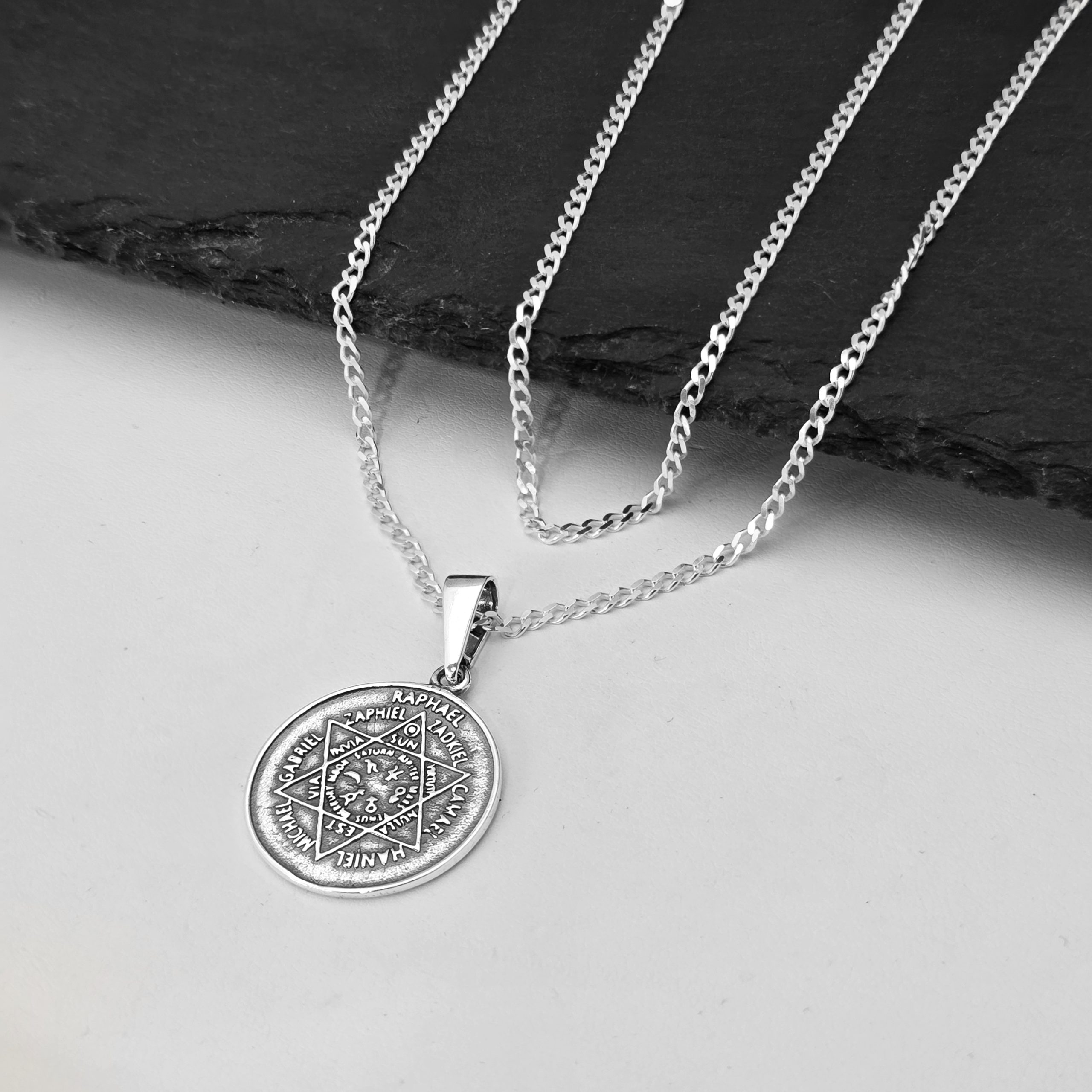 Srebrny naszyjnik z medalionem przedstawiającym pieczęć siedmiu Archaniołów to wyjątkowa biżuteria o głębokim symbolicznym znaczeniu. Medalion ozdobiony jest starannie wykonanym wzorem, który ma chronić noszącego i wspierać go mocą Archaniołów. Siedmiu Archaniołów to potężni opiekunowie, którzy reprezentują siły światła i duchowej ochrony. Naszyjnik wykonany z najwyższej jakości srebra jest doskonałym wyborem dla osób poszukujących zarówno eleganckiego dodatku, jak i talizmanu ochronnego. Idealny na co dzień oraz na wyjątkowe okazje.