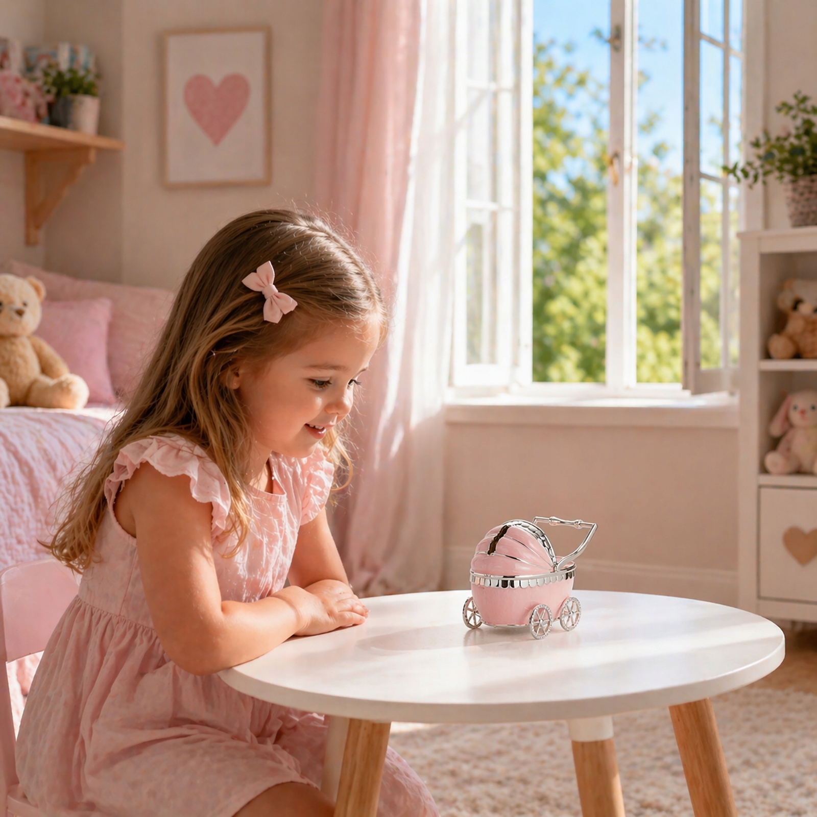 Strona główna / Produkty / Katalog Biżuterii / Okazjonalne / Skarbonka Dekoracyjna Wózek Różowy Stylowa Pamiątka dla Dziewczynek Chrzest
